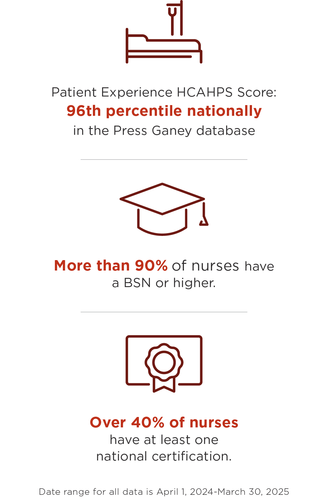 Our nurses care for people in their most vulnerable moments, honoring their dignity and earning their trust. Every touch and decision reflect clinical expertise and the soul of nursing—the quiet strength, intuition and humanity. Guided by this powerful blend, we are driven to go beyond expectations, delivering care that heals, outcomes that matter and experiences that leave lasting comfort and confidence.